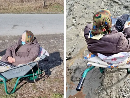VIDEO „Infrastructură”, în România 2023: Bătrână de 85 de ani, dusă cu roaba la ambulanță prin noroi