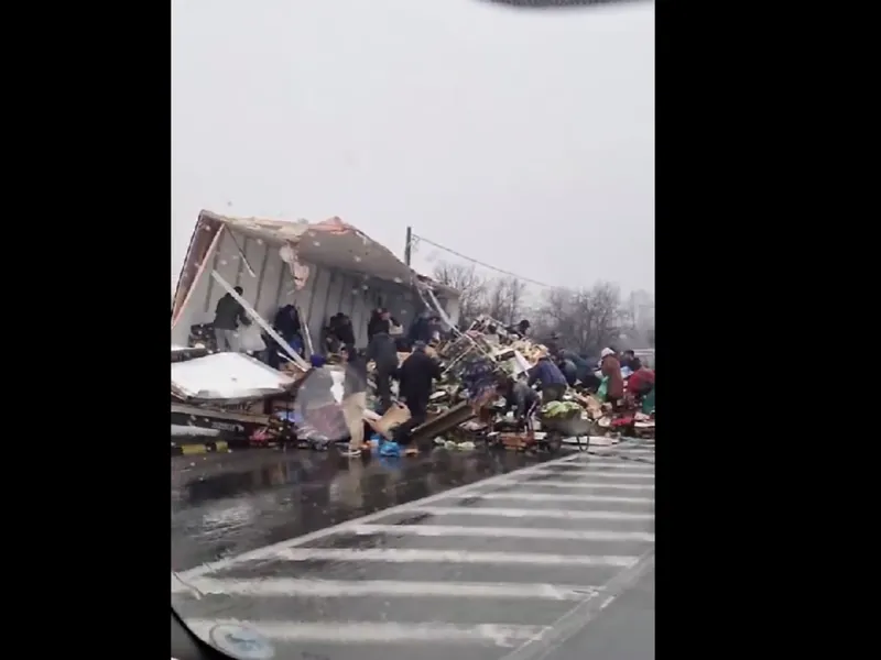 VIDEO Localnicii au furat cu roaba produse dintr-un camion răsturnat. Golit până să vină poliția