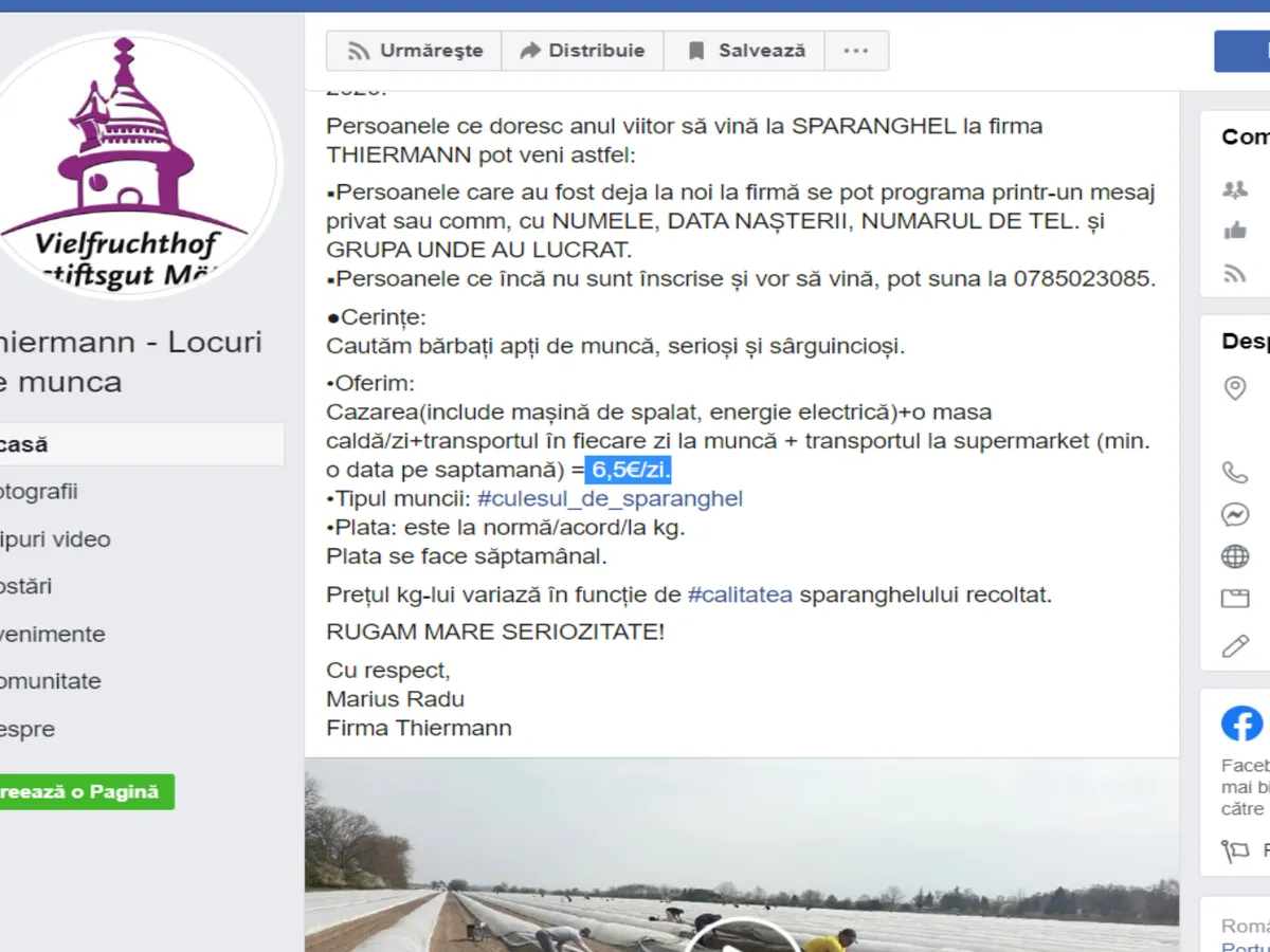 O căutare pe Internet folosind cuvinte cheie precum „muncă”, „Germania”, „sparanghel” îți găsește zeci de anunțuri, din ani diferinți, prin care românii sunt momiți să muncească în agricultura germană.