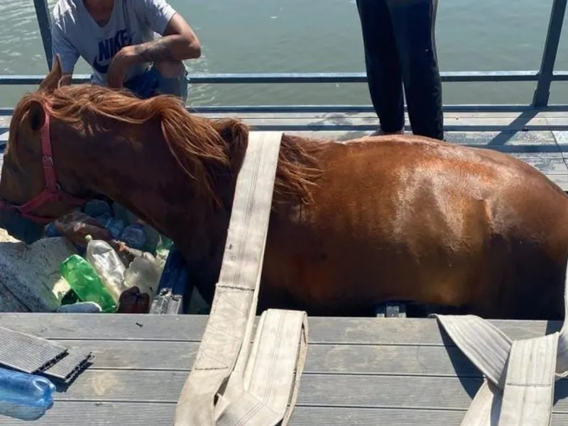 Un cal a căzut printre scândurile care formează puntea noului ponton construit de Primăria Alba Iulia. Incidentul s-a petrecut marți, iar pentru a-l scoate pe cal dintre scândurile rupte a fost nevoie de intervenția pompierilor de la ISU Alba.