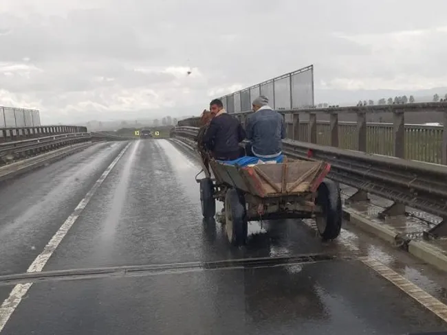 VIDEO O căruță circula pe Autostrada 1, în apropiere de Sibiu, într-o zonă fără loc de refugiu