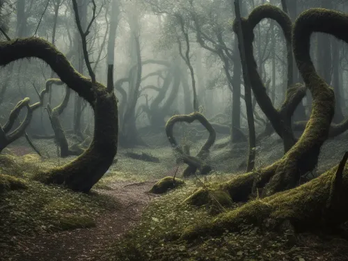 Ne îndreptăm lanternele spre copacii deformați - mulți copaci de aici cresc în zig-zag sau în spirală, un fenomen care nu a fost explicat în mod plauzibil de niciunul dintre oamenii de știință care au venit să investigheze. Mai mult decât atât, fiecare copac care spiralează o face în sensul acelor de ceasornic.
