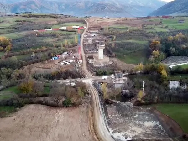 Constructorul lucrează să înalțe „picioarele” celui mai spectaculos viaduct de pe traseu, după cum se observă dintr-o recentă filmare din dronă.