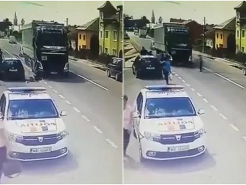 Camerele de supraveghere au surprins momentul în care un camion reușește să frâneze și să atenueze impactul cu un pieton ce traversa neregulamentar. Martorii spun că e vorba de o polițistă. Autoritățile neagă.