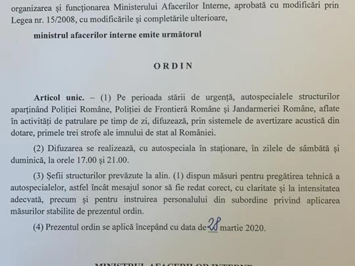 „Începând de astăzi, mașinile poliției, jandarmeriei și poliției de frontieră, aflate în patrulare pe timp de zi, vor difuza, prin sistemul de avertizare acustică din dotare, primele trei strofe ale Imnului de Stat al ROMÂNIEI!”.