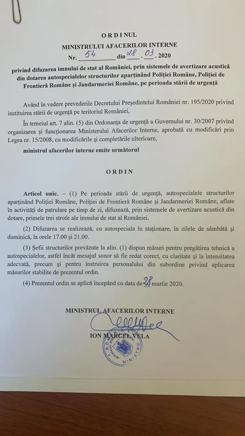 În fiecare weekend, pe perioada stării de urgență, mașinile Poliției Române, Poliției de Frontieră și Jandarmeriei vor difuza imnul național, la orele 17.00 și 21.00, potrivit unui ordin al ministrului de Interne, Marcel Vela.