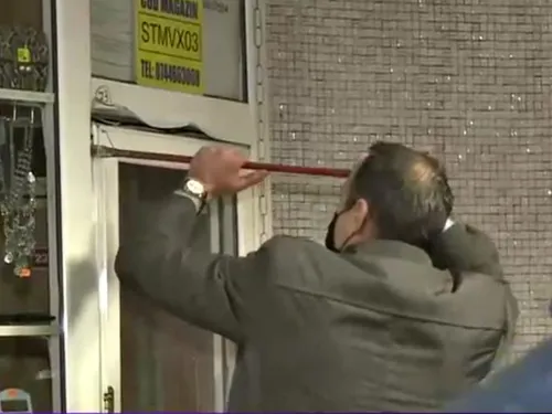 „N-au voie... Nu ție rușine să pui mâna pe rangă, nesimțitule” se aude cum strigă un comerciant în timp ce șeful Metrorex pune mâna pe rangă și începe să forțeze ușa chioșcului.