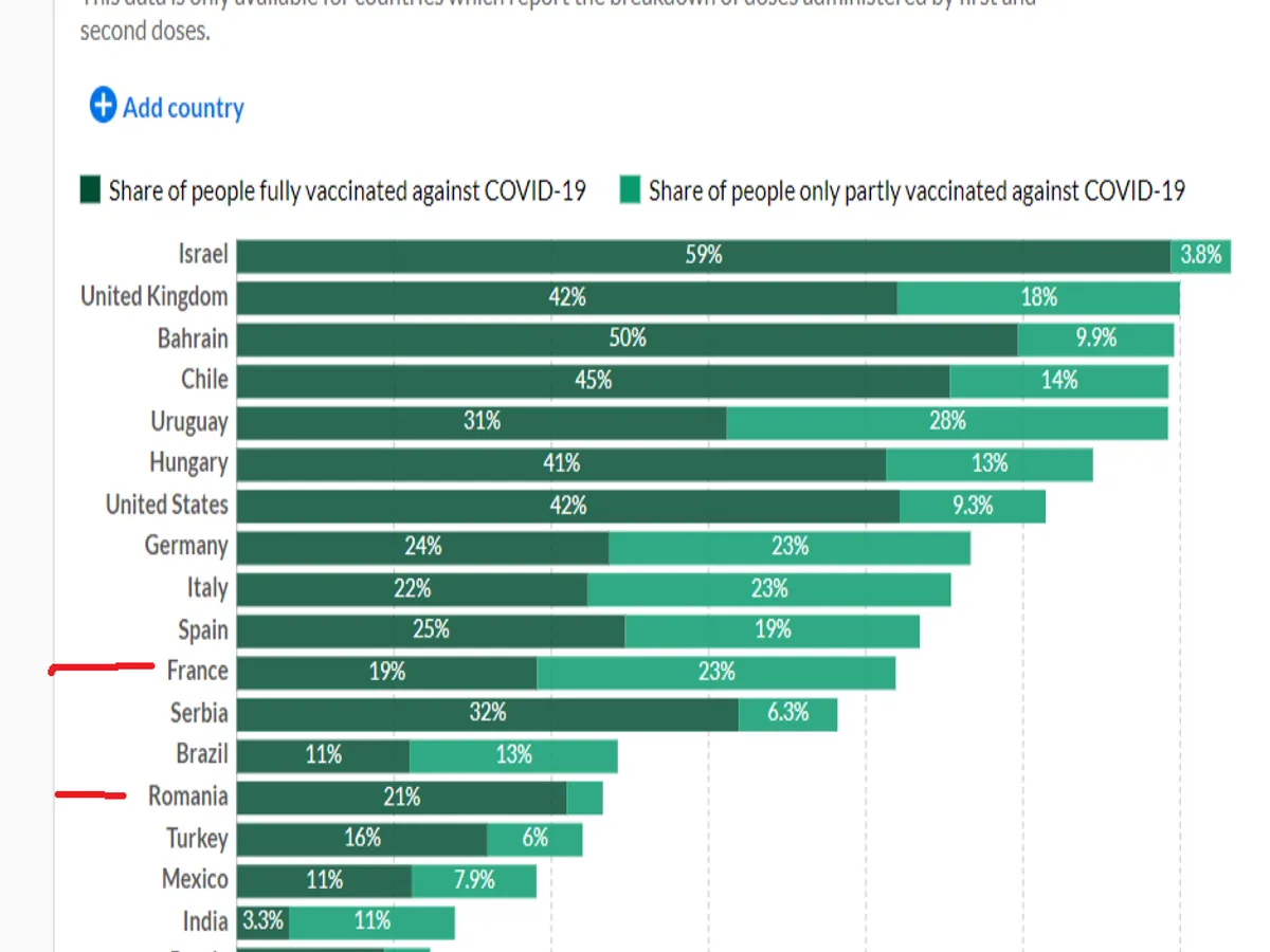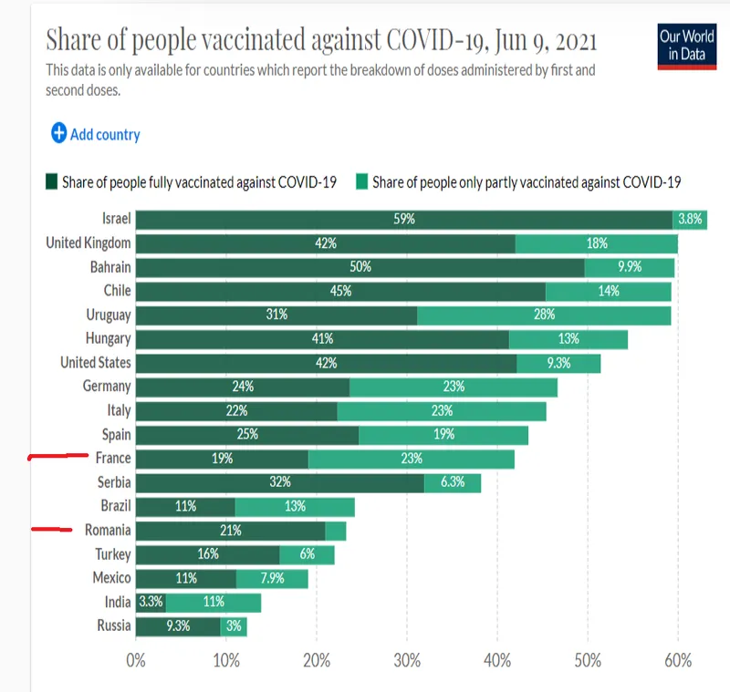 În România s-a vaccinat 24% din populație. În Franța, a primit prima doză de vaccin 41% din populație.