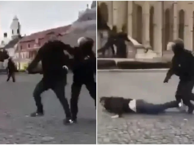 Imagini surprinse înaintea partidei, în centrul orașului Cluj-Napoca, arată cum un ultras stelist este doborât de un croșeu al unui jandarm, într-o secvență de o violență ieșită din comun, conform GSP.