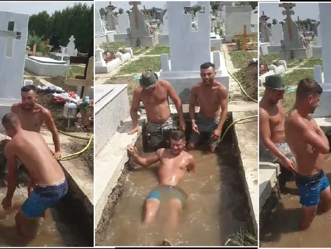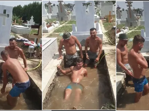 Trei gropari din Constanța s-au gândit să se răcorească umplând cu apă o groapăde mormânt. Mai mult, s-au și filmat și au postat isprava pe rețelele de socializare cu un fond muzical vesel, de vară.