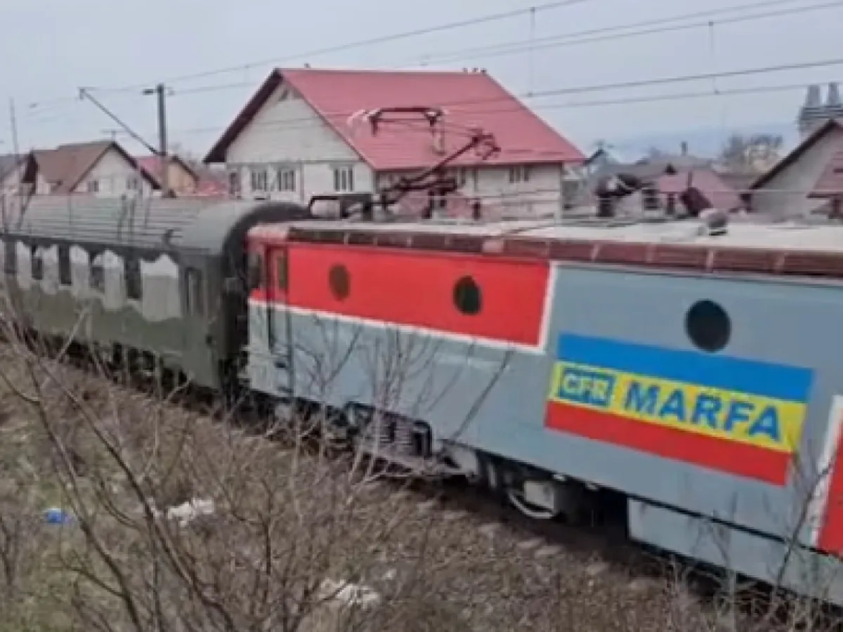 „După cum vedeți în video un tren tras de o locomotivă CFR MARFA cu echipament militar trece cu viteza foarte mare prin Veresti, judetul Suceava, aproape de UCraina