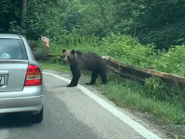 Un bărbat care se afla într-o mașină cu numere de Argeș a fost filmat când arunca cu o sticlă din mașină într-un urs care se afla pe marginea șoselei. Cine este animal în stiuația asta?, se întrebă cel care a postat clipul video.