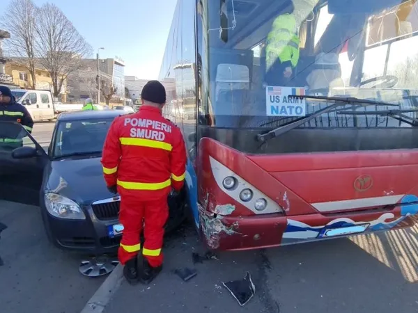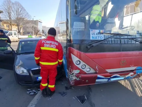 Autocarul, care avea afișat pe parbriz US Army și NATO, a fost implicat într-un accident pe B-dul IC Brătianu din Constanța.