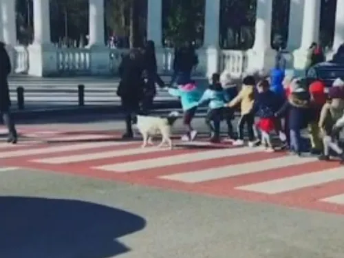 VIDEO Un cățel din Georgia ajută copiii de la o grădiniță să traverseze strada