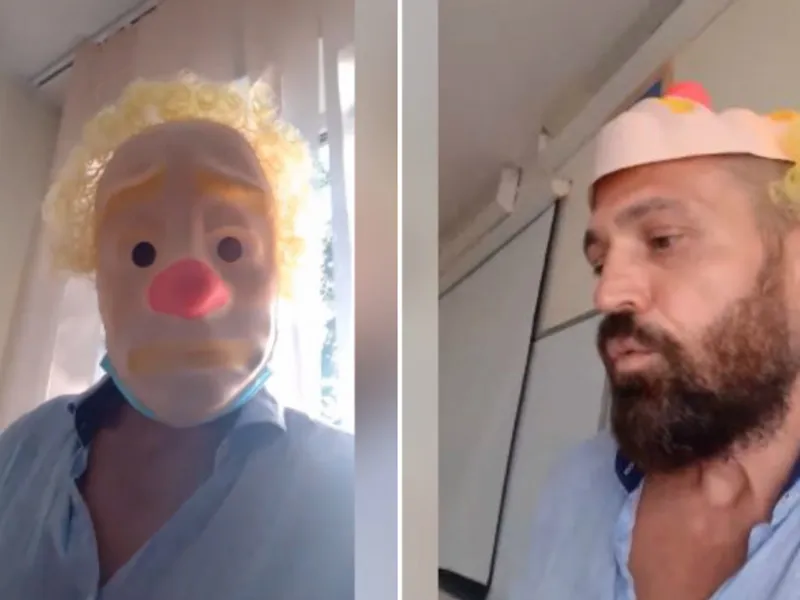 Un profesor de sport din Oradea a pus la cale în clasă o scenetă, în care i-a implicat și pe elevi: și el, și copiii purtau măști ale unor personaje de benzi desenate. Scopul: să-i învețe că măștile anti-COVID sunt vătămătoare.