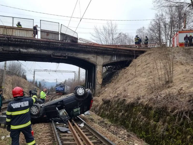 În accident a fost implicat un autoturism care, în timp ce circula pe un pasaj rutier peste calea feratã, în condiții care urmează a fi cercetate și lămurite de polițiști, a pierdut controlul asupra direcției de mers, a sărit de pe pod și a ajuns pe platforma feroviară.