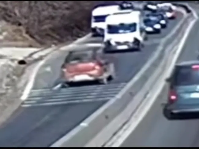 La apropierea de un viraj la stânga, șoferul Daciei dă nas în nas cu un TIR și o dubă, care reușesc să evite un impact. Frânează și oprește. Alte zeci de vehicule îl ocolesc și, miraculos, nu are loc niciun accident.