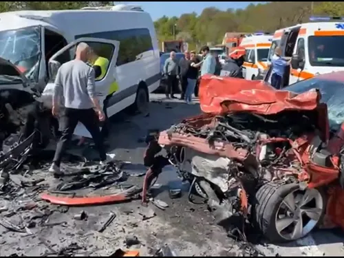 VIDEO Un șofer s-a înfipt cu aproape 100 km/h într-un microbuz de persoane. „Minune”, niciun mort