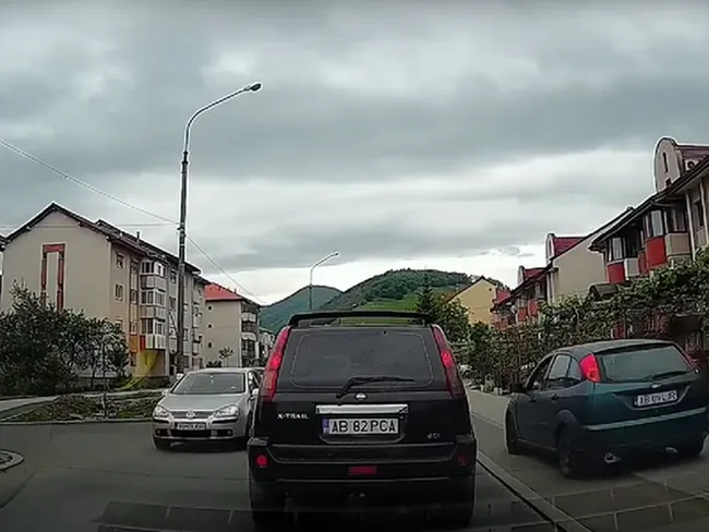 Un şofer a fost filmat în timp ce face o depăşire pe partea dreaptă, pe trotuar, în oraşul Cugir, judeţul Alba, ne având răbdare să autoturism aflat în față să vireze stânga.