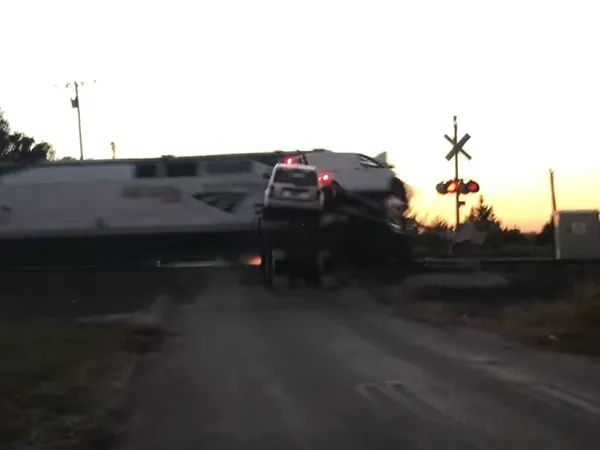 Garnitura AMTRACK a spulberat autocamionul și a aruncat la câțiva metri în aer mașinile pe care le transporta acesta.