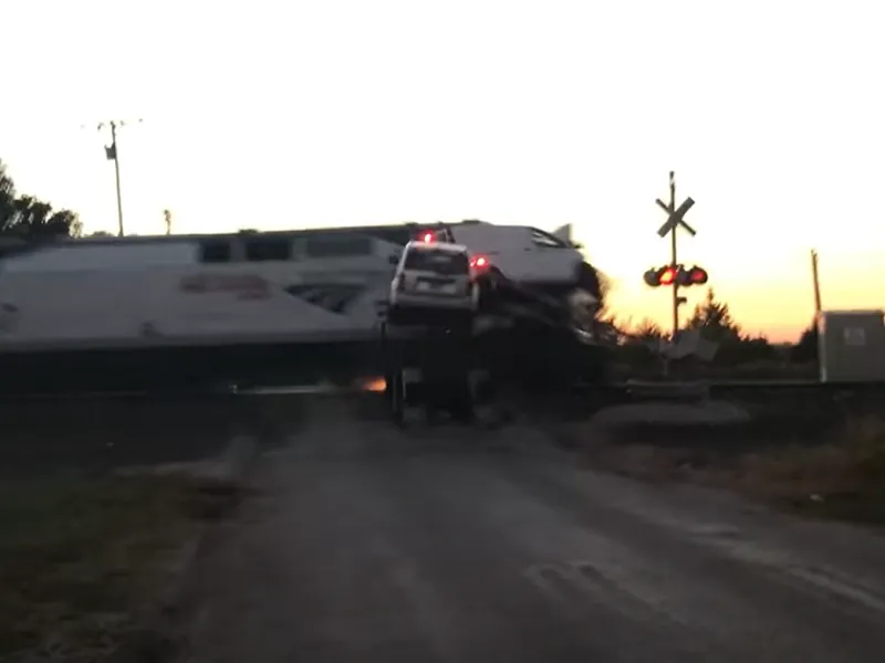 VIDEO Un tren a spulberat un trailer blocat pe calea ferată aruncând mașinile în aer la câțiva metri