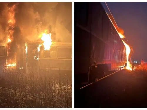 Un tren CFR a luat foc, în Bistrița-Năsăud. Zeci de persoane au fost evacuate de urgență. Pompierii militari intervin pentru stingerea unui incendiu.