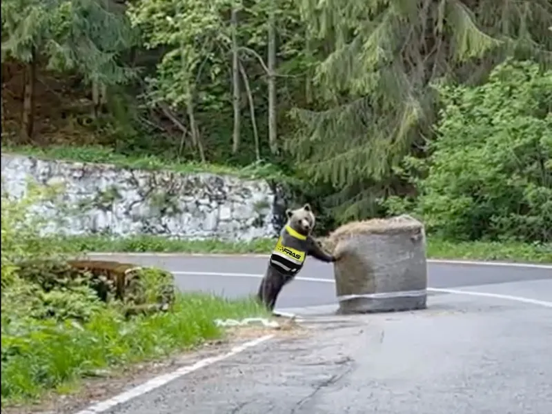 VIDEO Un urs a fost filmat la Raliul Argeşului, în timp ce mută un balot de paie