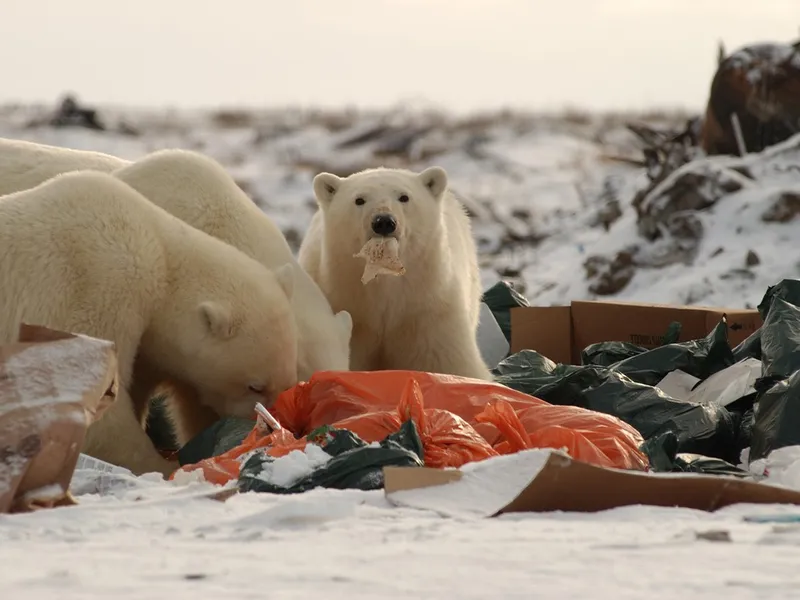 Resturile alimentare sunt deseori amestecate cu ambalaje, iar urşii polari ajung să înghită plastic şi alte materiale necomestibile, ceea ce le poate provoca blocaje fatale în organism.