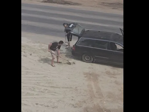 În imagini, se observă cum doi bărbați înarmați cu lopeți transformă în roabă un Passat break încărcându-l până ce mașina se lasă pe burtă cu nisip de pe marginea bulevardului Prelungirea Ghencea.