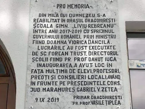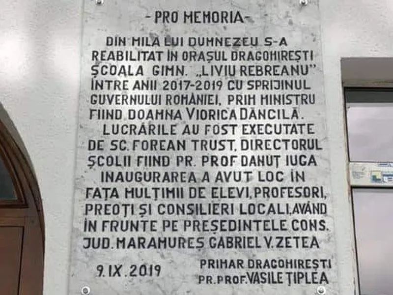 Textul de pe placa pusă de primar spune că: „Din mila lui Dumnezeu s-a reabilitat în orașul Dragomirești școala gimn. „Liviu Rebreanu”, între anii 2017-2019, cu sprijinul Guvernului României, prim ministru fiind doamna Viorica Dăncilă”.
