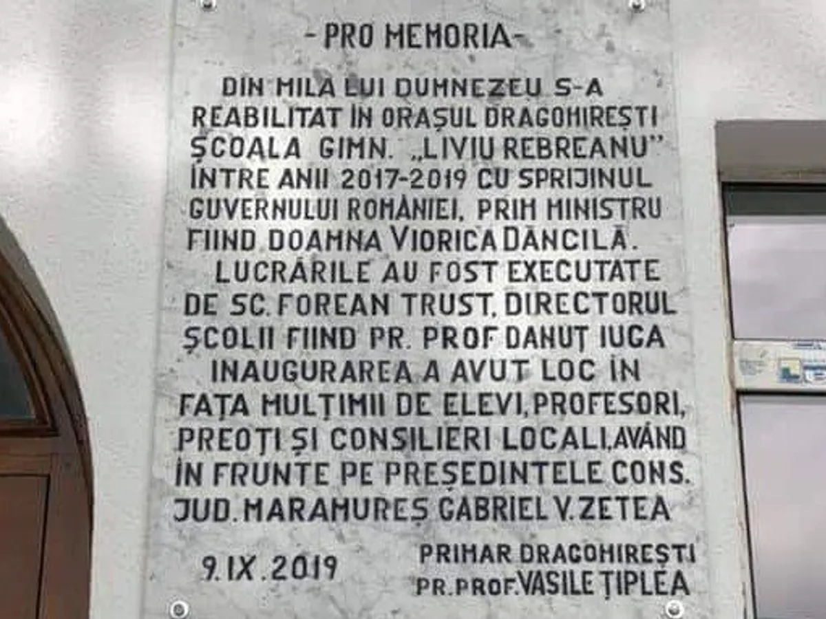 Imagini care depășesc ridicolul în orașul Dragomirești, județul Maramureș, unde primarul Vasile Țiplea a pus pe peretele unei școli recent renovate, o placă comemorativă prin care mulțumește Guvernului și Vioricăi Dăncilă pentru fonduri.