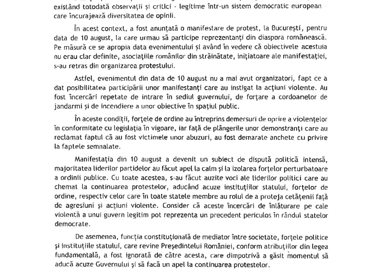 „Manifestația din 10 august a devenit un subiect de dispută politică intensă, majoritatea liderilor partidelor au făcut apel la calm și la izolarea forțelor perturbatoare a ordinii publice. Cu toate acestea, s-au făcut auzite voci ale liderilor politici care au chemat la continuarea protestelor, aducând acuze instituțiilor statului, forțelor de ordine, respectiv celor care în toate statele membre au rolul de a proteja cetățenii față de agresiuni și acțiuni violente. Consider că aceste încercări de înlăturare pe cale violentă a unui guvern legitim pot reprezenta un precedent periculos în rândul statelor democrate”, susține Viorica Dăncilă în scrisoarea trimisă conducerii Comisiei Europene.