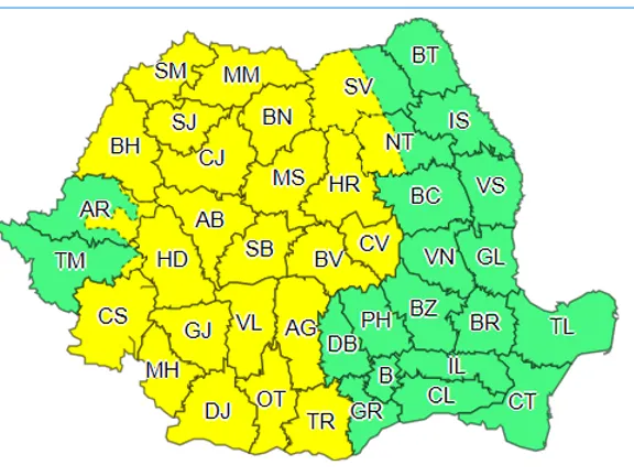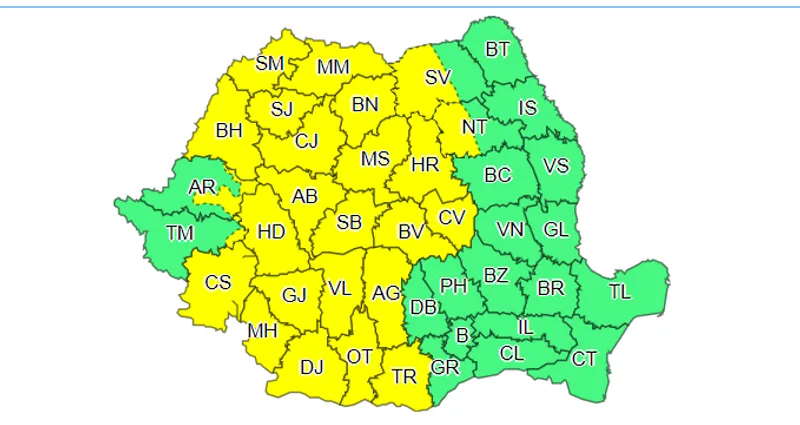 Totodată, meteorologii au emis o avertizare cod galben, valabilă de sâmbătă, de la ora 15.00, până duminică la ora 4.00.
