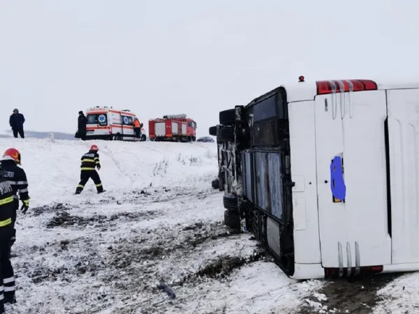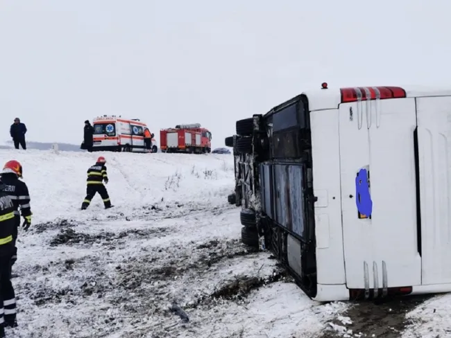 Vremea rea produce incidente în trafic. Masa de aer polar care a adus iarna în România a generat și primele probleme în trafic. Astfel, un microbuz cu 17 persoane la bord, care se deplasa pe o șosea din județul Galați, s-a răsturnat din cauza vântului puternic.