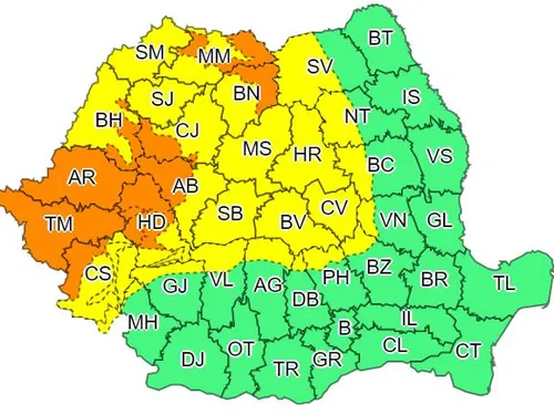 Avertizarea vizează zone din nouă judeţe, respectiv Maramureş, Bistriţa-Năsăud, Cluj, Alba, Hunedoara, Caraş-Severin, Timiş, Arad şi Bihor.