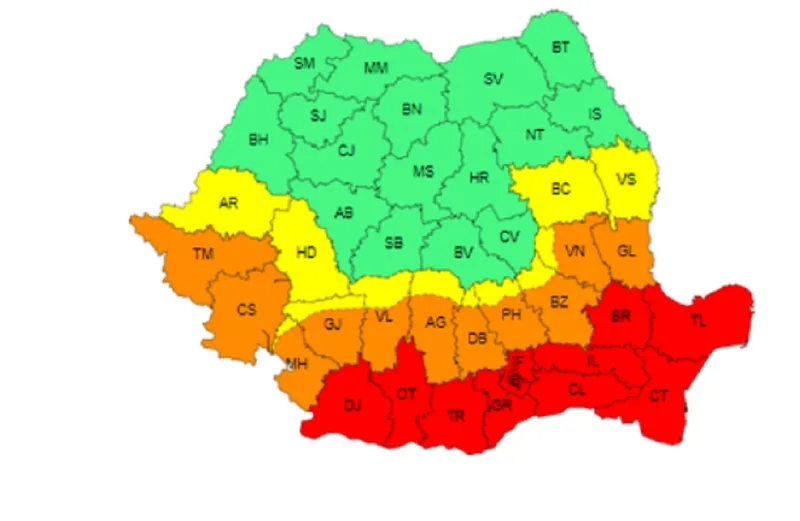În plus, este cod roşu de caniculă în judeţele Dolj, Olt, Teleorman, Giurgiu, Ilfov, municipiul Bucureşti, Călăraşi, Ialomiţa, Brăila, Tulcea şi Constanţa