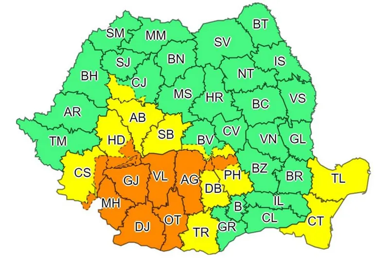 A fost emisă o avertizare Cod portocaliu în judeţele Argeş, Vâlcea, Gorj, Mehedinţi, Dolj, Olt şi în zona de munte a judeţelor Caraş-Severin, Hunedoara, Dâmboviţa şi Prahova.