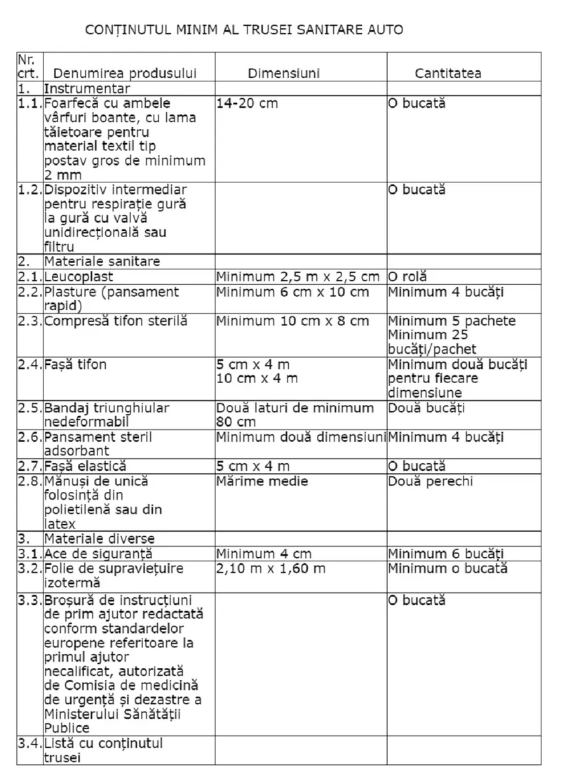 Ordinul 987/2007, dat de Ministerul Sănătății stabilește conținutul minim al trusei sanitare auto.