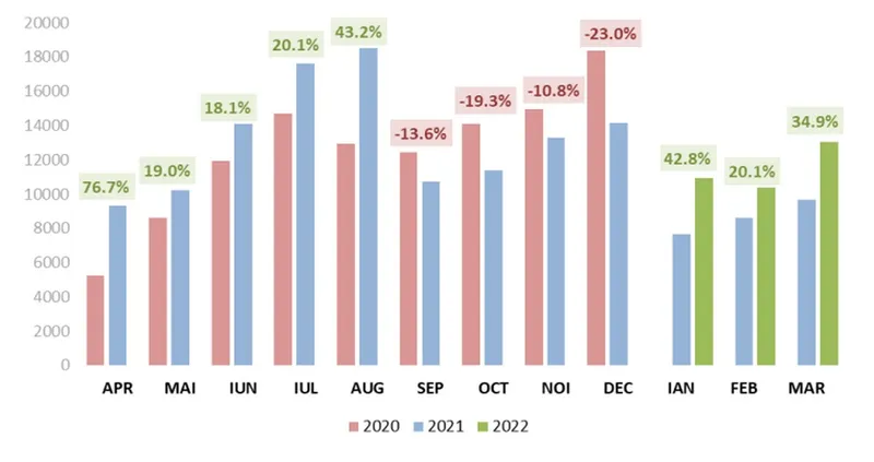 Mai mult, dacă ne raportăm la anii anteriori, luna martie 2022 este în creștere cu 61,0% față de perioada similară din 2020 şi cu 7,9%, faţă de martie 2019.