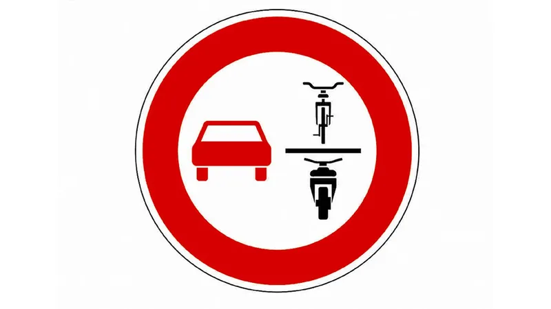 - Indicator care interzice șoferilor să depășească o bicicletă sau un moped: Acest indicator este rotund, cu o bordură roșie, și prezintă o mașină roșie lângă o bicicletă și un scuter negru. Doar vehiculele cu două roți, fie ele motorizate sau nu, au voie să depășească, ceea ce contribuie la fluidizarea traficului.