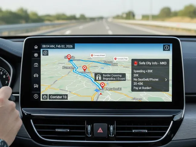 Dacă vă planificați o astfel de călătorie, trebuie să luați în calcul că, din februarie 2026, în Macedonia de Nord funcționează un sistem performant de camere radar inteligente fixe, care înregistrează automat aproape orice abatere: viteză, nepurtarea centurii de siguranță (inclusiv de către pasagerii de pe bancheta spate), utilizarea telefonului mobil la volan.