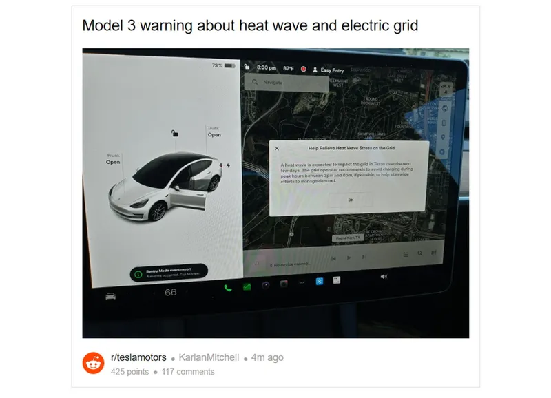 „Se așteaptă că un val de căldură va afecta rețeaua din Texas în următoarele zile. Operatorul de rețea recomandă evitarea încărcării în timpul orelor de vârf între orele 15:00 și 20:00, dacă este posibil, pentru a ajuta eforturile la nivel de stat să gestioneze cererea”, a apărut scris pe bordului modelelor Tesla.