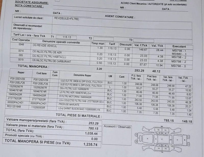 Deși nu a schimbat decât filtrele și uleiul, mașina ne având nevoie de nicio altă interveție sau piesă, factura a fost de 1.235 de lei, adică circa 70% din salariul minim net pe economie în România care este de 1.898 de lei.