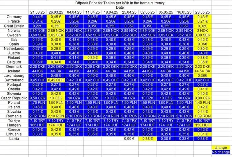 Un posesor de mașină electrică, probabil de Tesla, a monitorizat prețurile de la stațiile de încărcare Tesla Supercharger din Europa, în perioada 21 martie - 23 mai 2025 și a realizat un tabel extrem de util cu prețurile energiei electrice și variația acestora în intervalul menționat.
