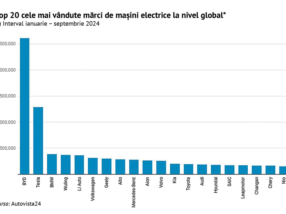 În intervalul ianuarie – septembrie 2024, BYD a vândut 2.607.970 de mașini electrificate (BEV + PHEV), Tesla, 1.291.279 unități, și BMW, 388.590 unități. Iar pe locurile patru și cinci la nivel mondial se află chinezii de la Wuling și Li Auto, cu 371.386 unități și, respectiv, 362.165 unități, potrivit datelor Autovista.