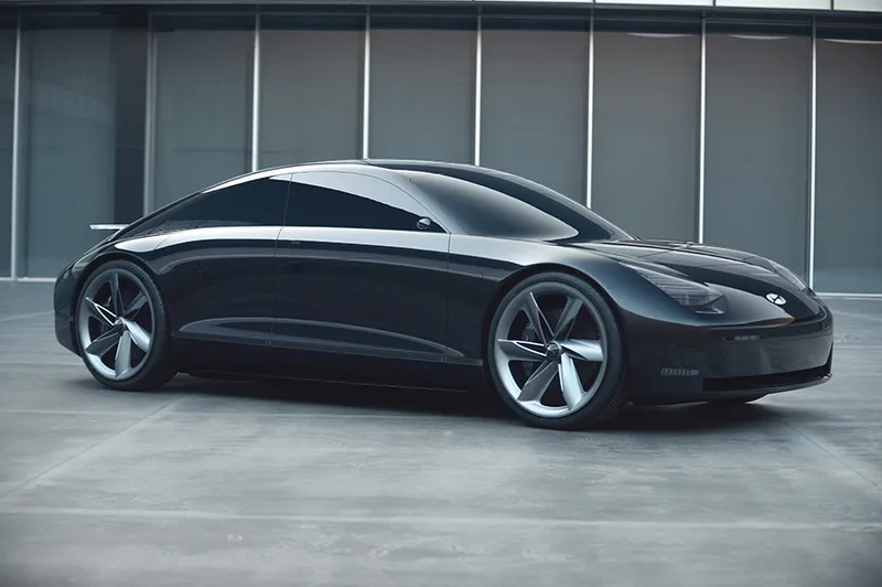 Mașina urmează formele și proporțiile studiului “45“, dezvăluit de Hyundai anul trecut, și, inedit, are două joystick-uri în loc de volan, ceea ce presupune, probabil, și existența unui sistem avansat de condus autonom.