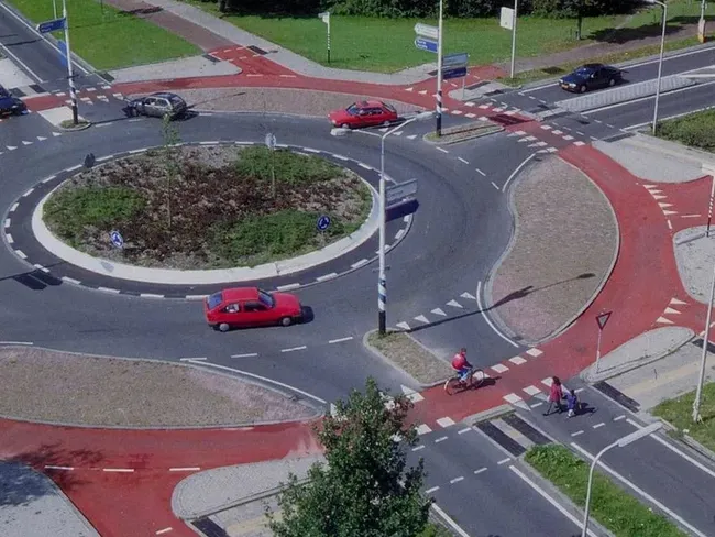 Regula: Un sens giratoriu olandez este un sens giratoriu care separă fluxurile de trafic și îi protejează pe cei mai vulnerabili participanți la trafic.