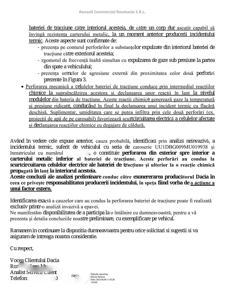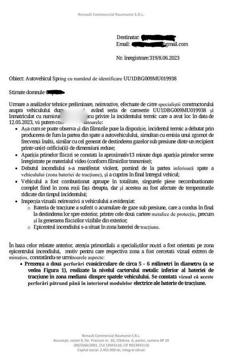„Având în vedere incidentul din data de 12.05.2023 când autoturismul proprietate personală marca Dacia Spring a luat foc in mers, în mașină aflându-se sotia și copilul meu, am decis să postez public răspunsul primit de la Mioveni, astfel încât să cunoască absolut toată lumea poziția unei "companii de top" față de un incident de asemenea amploare.