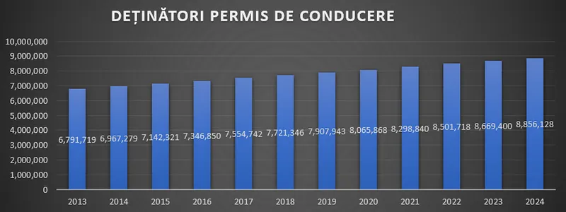 La sfârșitul anului 2024, în României, existau 8.856.128 de deținători de permise de conducere. Dintre aceștia, 1.172.333 au domiciliul în București.