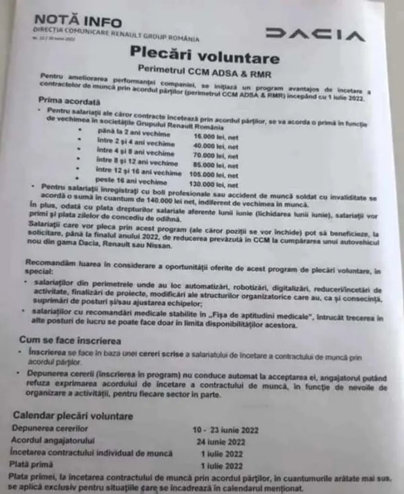 Dacia i-a anunțat pe angajații săi de la Mioveni că, „pentru ameliorarea performanței companiei, inițiază un program avantajos de încetare a contractelor de muncă prin acordul părților începând de la 1 iulie”. Cei care acceptă condițiile trebuie să depună o cerere în intervalul 10 – 23 iunie.